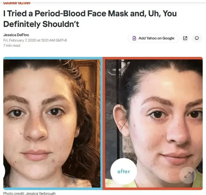 2020年,美妆记者Jessica DeFino亲自尝试了经血面膜,然后写了篇文章: