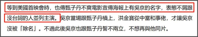 后续影片在国外上映,甄子丹又被质疑排挤吴京,说不想和没台词的人并列主演,最后据港媒爆料,还是洪金宝出来调停,才让吴京没被除名。