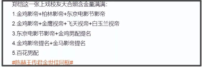 这张合影上有11个人,其中有8个都是大家熟悉的明星,如郑恺、彭昱畅 、陈赫、王传君、金世佳、雷佳音、王景春、杜江,也就是许大茂、阿如那等不熟,而这张含金量满满的照片也被吐槽是资源咖扎堆,王景春、王传君拿过国际电影节影帝,雷佳音拿过视帝,彭昱畅也拿过最佳男主,还有一些男配奖,不少网友还认为年纪轻轻且唯一不是表演系出身的彭昱畅能加入其中过于幽默。