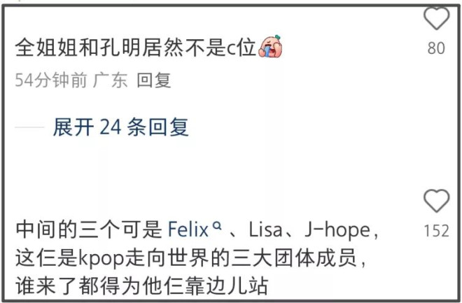 对于Lisa的C位及其他两位副C,粉丝们也给出了相当大的肯定,称这三位爱豆所在的团体都是KPOP走向世界的三个团,谁来了都得旁边站,口气十分嚣张。但从各种讨论中可以看出大家对Lisa的C位没有任何意见,除了团体火之外,LV三太子女朋友的身份也给了很大加持。