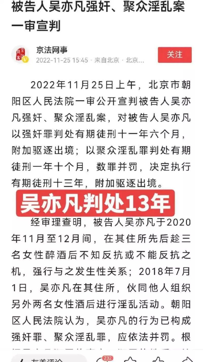 紧接着,2022年11月的一审宣判更是给这事盖了棺:强J罪、聚众YL罪数罪并罚,十三年有期徒刑加驱逐出境,税务部门还追罚了6个亿。
