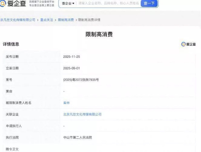 就在前不久的11月28号,爱企查上一条新记录把吴亦凡又拉回了公众视野:他的老东家北京凡世文化传媒有限公司,新增了一条限制消费信息。