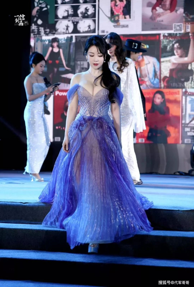 她身着的渐变蓝紫色抹胸长裙,宛如将梦幻的晚霞披在身上 。从裙摆底部的深邃幽蓝,逐渐过渡到胸口处的浪漫淡紫,色彩的自然融合宛如一场视觉魔法,神秘又迷人。