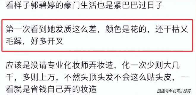 其实郭碧婷现在确实经济状况不算宽裕,脸还能靠基因撑着,头发就能看出来了,估计都很少做保养。她虽然之前在娱乐圈打拼挣到不少钱,但是婚后连着数年在家生孩子,工作早就没多少了。而向家不会给她多少钱,现在郭碧婷爸爸生病,向家也没什么表示,郭碧婷出钱出力,还得腾出时间照顾年幼的孩子、难缠的婆家,真有点身心俱疲了。