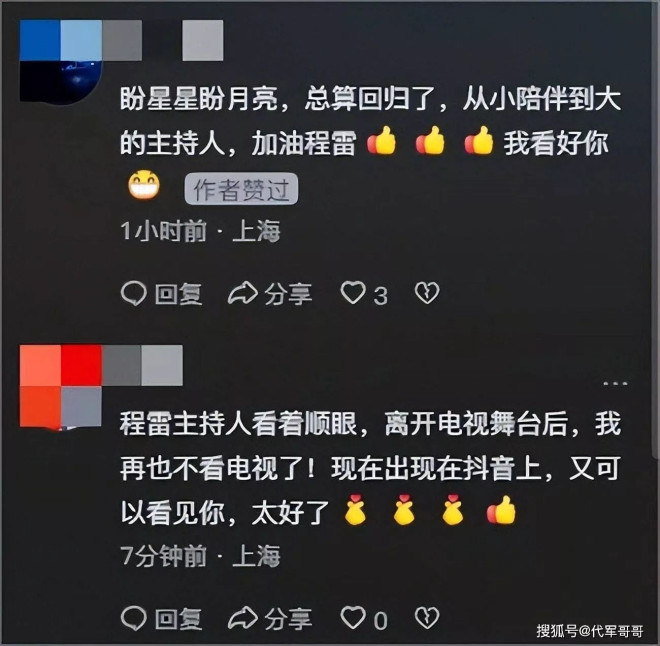 因此,当他的复出视频发布后,在上海地区引发了尤为热烈的传播。上海观众对他的喜爱,不仅仅是对一位主持人的认可,更蕴含着一种浓浓的地域情怀。在他们眼中,程雷就像是生活中的一位老友,陪伴着他们见证了生活的变迁,承载着这座城市的记忆与情感。同时,程雷多年来在主持行业积累的专业度与亲和力,也为他打造了一层耀眼的职业滤镜。他在舞台上的每一次精彩表现,无论是对节目流程的精准把控,还是对嘉宾和观众情绪的巧妙调动,都让观众们对他的主持能力称赞不已。
