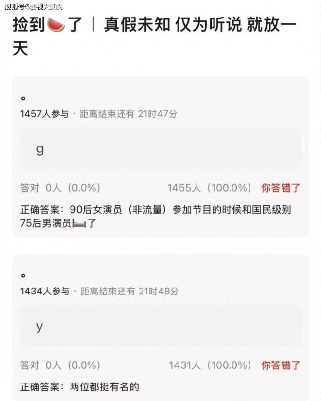 据悉,这个瓜是瓜主从圈内听到的,就放一天,某90后女演员,并非流量女星,在参加节目的时候和国民级别的75后男演员睡觉了,很多人猜测是不是g和y,都被认定为答错了,瓜主补充说:“两位都挺有名的”,关于“是否出轨”,因为双方都没有明面上的妻子和对象,所以瓜主的答案是“应该没有吧”。