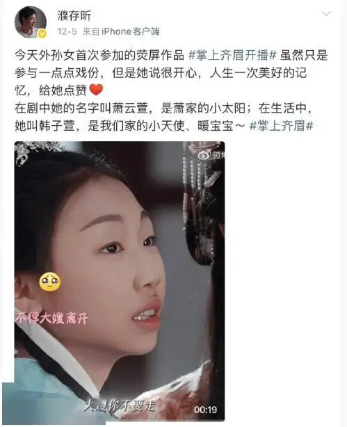 虽然媒体报道韩子萱是剧组通过选角进入的,但议论普遍认为她如果不依靠姥爷的人脉,很难入行。
