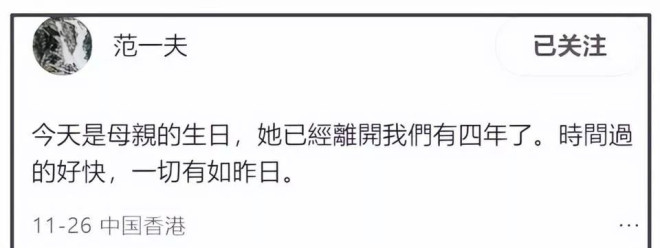 他不仅与范曾、徐萌夫妇关系融洽,主动分享他们的生活照,也时常在网络上追忆缅怀自己的生母楠莉。