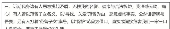 在范曾的声明里,他将断绝关系的原因指向了女儿的行为。他认为范晓惠是以关爱父亲为名,恶意虚构事实,并在公开场合诽谤妻子徐萌。