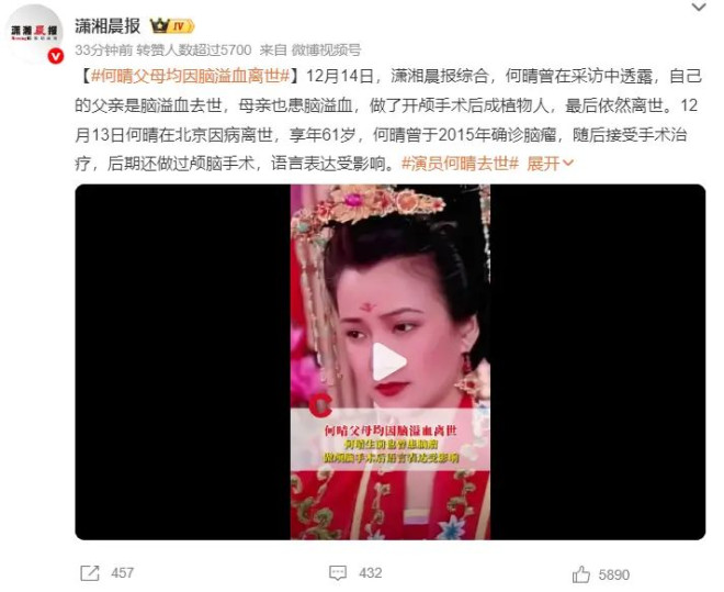 12月14日,潇湘晨报综合,何晴曾在采访中透露,自己的父亲是脑溢血去世,母亲也患脑溢血,做了开颅手术后成植物人,最后依然离世。