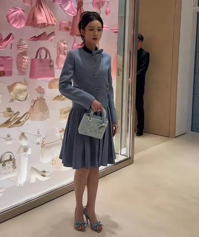 周也灰蓝色小香风西装套裙,剪裁利落,领口点缀银色链条,裙摆刚好到膝盖,显腿长又不露骨。