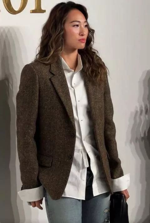 这位刚拿完美网亚军的23岁姑娘,穿迪奥男装系列棕色短款西装搭配牛仔裤,单手插兜站在柜台前。