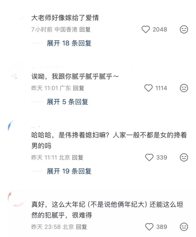 两人一路上挽手同行,偶尔凑近聊两句,看起来很是恩爱甜蜜。关键还是大张伟挽着老婆手臂,毕竟大部分情况下都是老婆挽着老公多些,网友看了纷纷表示“大老师好像嫁给了爱情”“诶呦,我跟你腻乎腻乎腻乎”“真好,还能这么坦然的犯腻乎,很难得”。