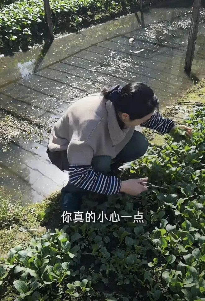 镜头一转,朱丹来到天理摘菜。金华那边雨水真的很多,看着路边满是水洼、就像刚下过雨的模样。