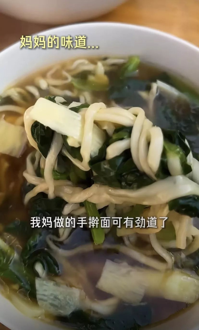 回到家后,朱丹妈妈用新摘回来的菜,做了一碗手擀面。妈妈做的手擀面很筋道、添加了新鲜的青菜,吃起来特别满足。