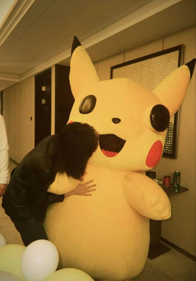 照片中,有三只玩偶服:中间是皮卡丘;一边是青蛙;另一边则是一个搞笑的大熊。