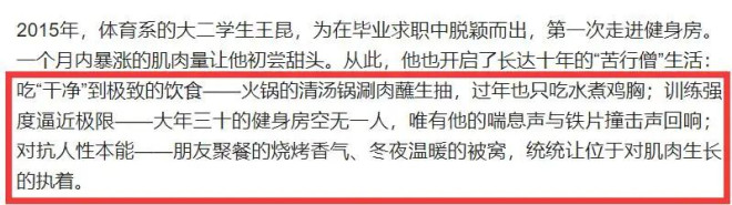 在采访中,王昆告知为了控制肌肉力量和舞台表现力,他这十年过着“苦行僧”的生活,过年也只吃水煮鸡胸,火锅清汤涮肉蘸生抽。