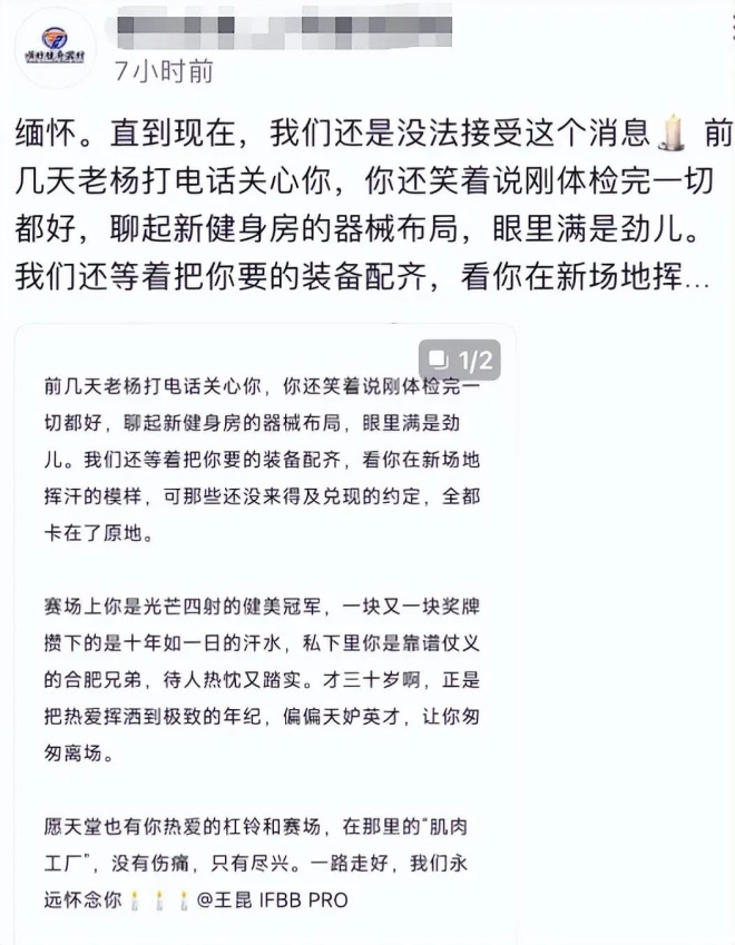 健身圈的好友还告知,王昆近期一直在忙碌新店开业,加上训练强度大,不舍得劳逸结合,过度劳累导致噩耗。