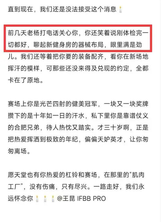另外,好友还告知,王昆前几天刚体检完,一切都好,还聊起新健身房的器械布局,王昆眼里满是劲儿,大家还等着他把装备配齐,看他在新场地挥汗的模样,可惜这些约定永远无法兑现了。