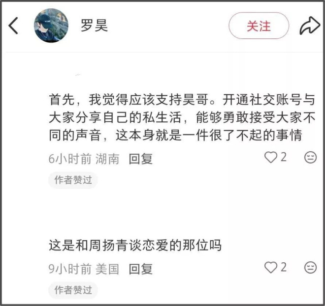 罗昊分享女装照之后,还点赞了网友夸他勇敢的评论,哪怕被吐槽像大婶,态度都很平和,更没有避讳和周扬青之前的那段恋情。