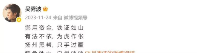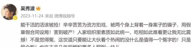 2023年,面对媒体的追问,吴秀波曾连发两条动态喊冤,称自己是“辛辛苦苦为资方拍戏,被两个身上背着一身案子的骗子,用假章假合同设局!害到破产”。