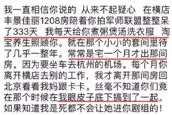 她的指控还不止于此,她指出吴秀波还有其他出轨对象,并直接点明了同在《军师联盟》中饰演甄宓的女演员张芷溪。