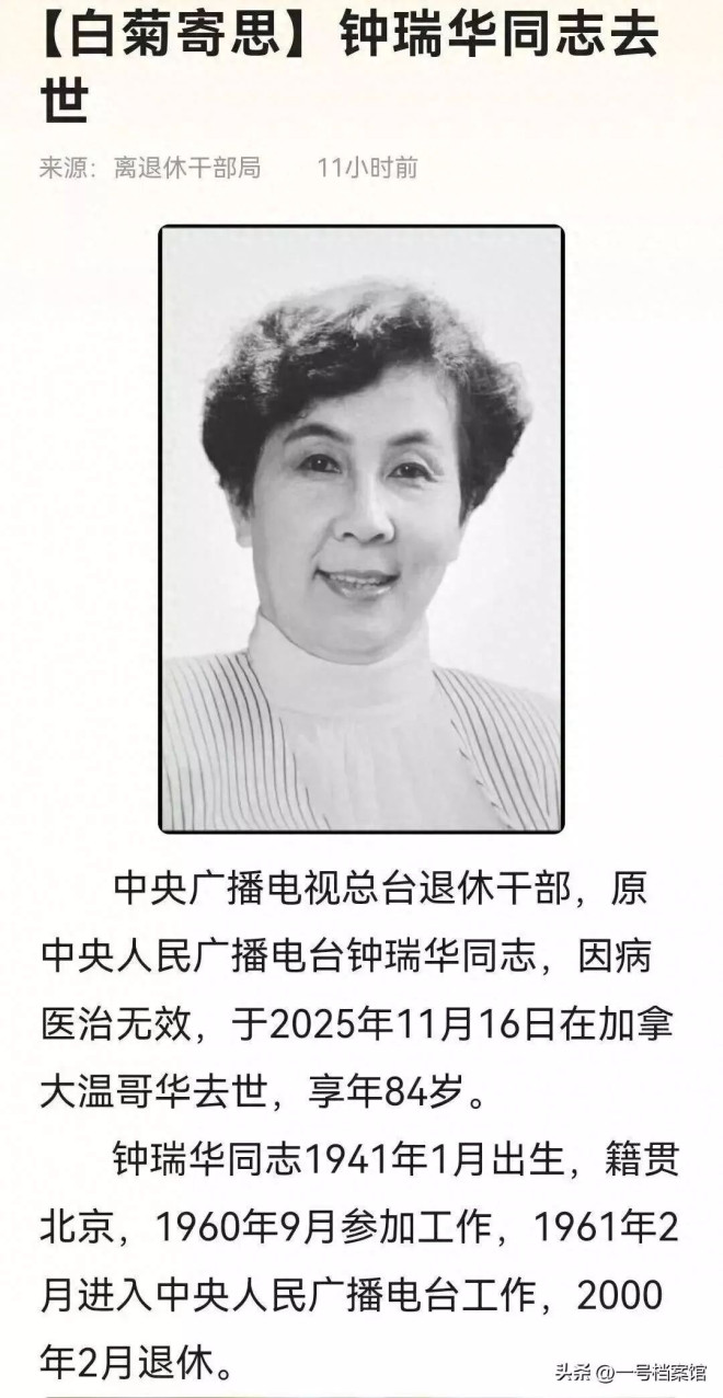 没想到央视著名播音员钟瑞(本名钟瑞华)离世了,大家曾经在《新闻和报纸摘要》里见证了她的风采。