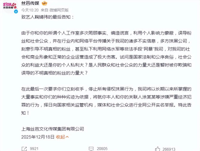 丝芭传媒今日以"最后通牒"形式指控艺人鞠婧祎及关联人涂某某涉嫌"严重经济犯罪",宣称将向监管部门实名举报,将双方持续两年的合约纠纷推向刑事指控层面。