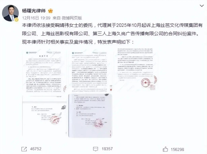 鞠婧祎方面驳斥1.39亿含工作室运营成本,实际分成仅15%-20%(行业头部通常30%-50%),并指控丝芭通过"双重合同"隐瞒真实收入。