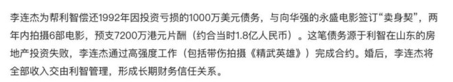 更让人震惊的是,利智当年投资房地产遭遇泡沫破裂,欠下千万巨债,李连杰为了帮妻子还债,直接和永盛电影公司签下两年六部电影的“卖身契”,每部片酬1200万港币,硬生生靠密集拍戏帮利智还清了债务。