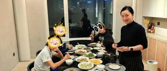 其中,徐小宝坐在凳子上,一只手放在桌面上,另外一只手拿着筷子比V;陶虹站着,扎着头发,身穿高领黑色上衣,搭配条纹裤子,身材保持得不错。肉眼可见,她是素颜状态,皮肤白皙、细腻,还是那么漂亮,感觉比实际年龄(53岁)要显年轻不少,更像40出头的样子。