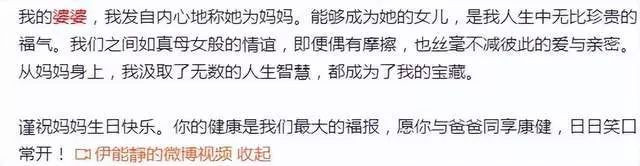 那伊能静也是个高情商的人,所以,婆媳两个相处起来十分愉快。伊能静就发文写道发自内心将婆婆当亲妈对待,即便婆媳俩偶有摩擦,但彼此间的爱与亲密丝毫不减,她还说在婆婆身上汲取了无数的人生智慧。