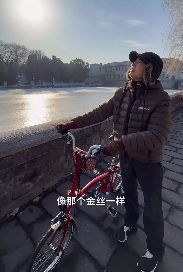 骑行前,董洁做足了保暖准备,穿着羽绒服,戴着手套和毛茸茸的垂耳帽,就怕骑行时冻着。