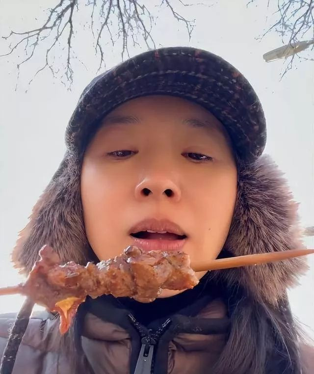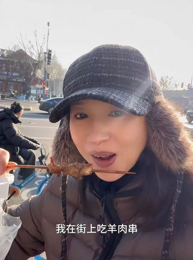 吃完糖葫芦,董洁又路过一家羊肉串小店,直接被香味吸引,买了一串站在路边就吃了起来。吃着吃着自己都笑了,估计也觉得自己太嘴馋。