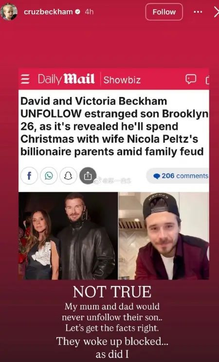 拉黑事件发生后,这个大家庭的小儿子克鲁兹出来澄清,表示贝克汉姆和维多利亚从来没取关过布鲁克林,是大哥把全家都拉黑了,甚至包括自己,这个家庭里的所有人都被拉黑了。