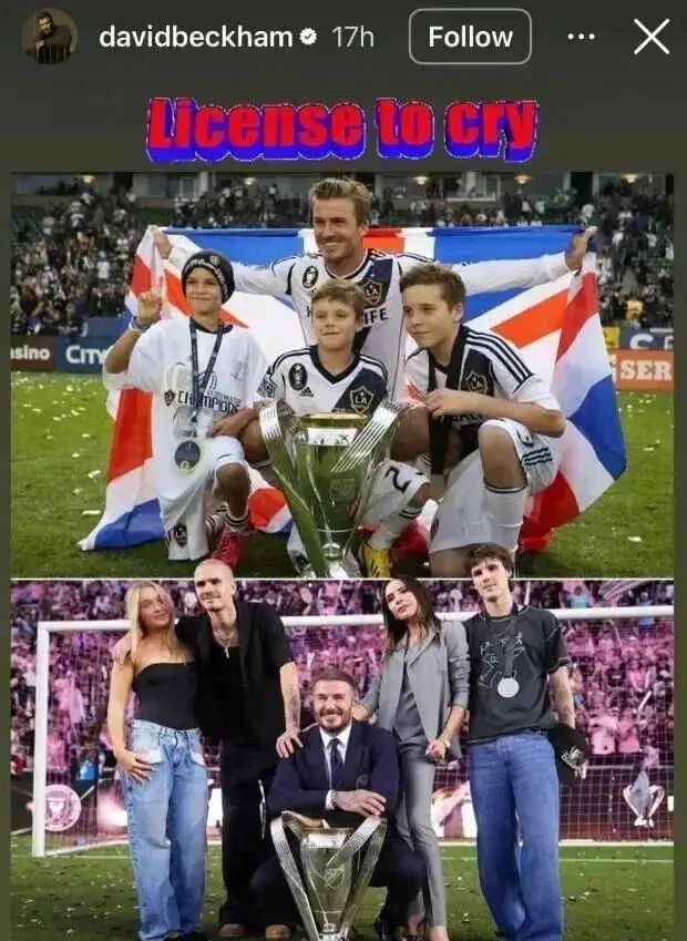 爸爸贝克汉姆晒出以前儿子们给自己加油打气的照片。