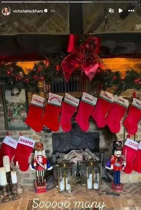 妈妈维多利亚晒出圣诞节的袜子,大儿子虽然都不在加了,还是把名字放在了c位。
