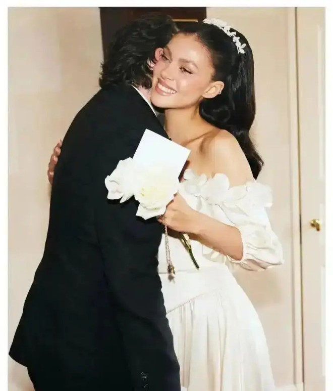 婚礼上,妮可拉穿着当年母亲结婚的婚纱,一脸幸福与丈夫布鲁克林相拥。