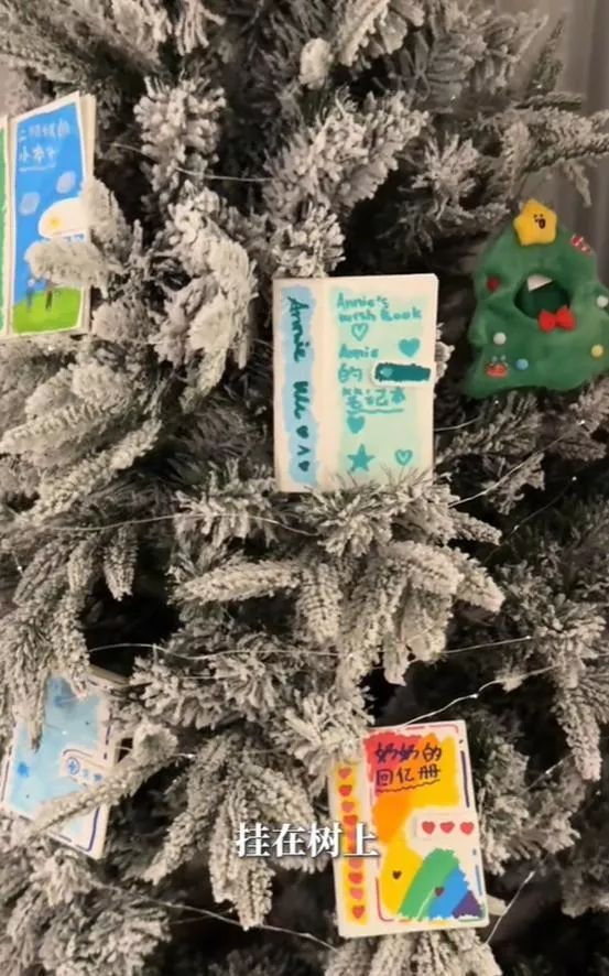 晒出的照片里,家里的圣诞树布置得满满当当,上面的挂饰全是女儿米粒亲手画的小本子,有“奶奶的回忆册”,还有“三阿姨的冰雪奇缘”,五颜六色的,看上去可爱极了。
