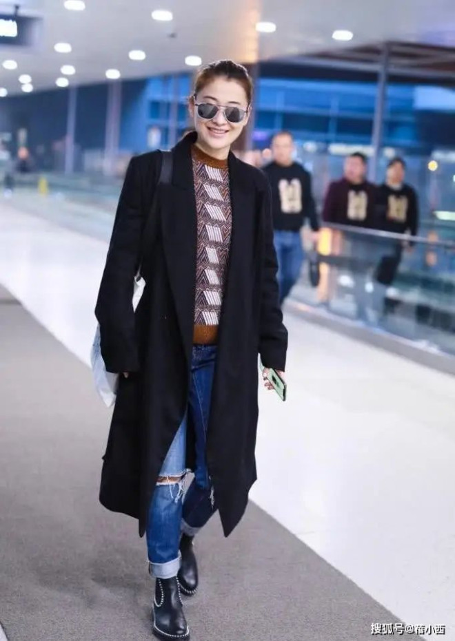 黑大衣与破洞牛仔裤的组合让人有些意外,毕竟前者适合天冷的时候穿,后者主要流行于夏季。