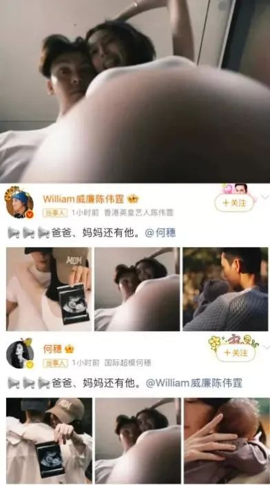 尤其是10月18日,他和何穗同步发文“爸爸、妈妈还有他”,配上B超照、孕期写真及新生儿合照官宣生子时。