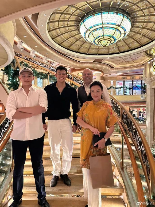 最吸睛的当属第三张全家合照,史可夫妇站左边,俩混血儿子站在右边。这俩小伙子是真没浪费基因,个个高大魁梧,五官立体,妥妥的 “长腿欧巴” 配置。难怪网友直呼:“混血基因太能打了,这颜值直接出道都够格!”