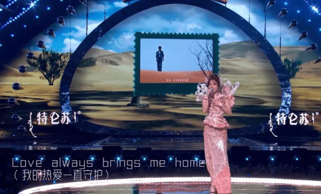 戚薇吊带长裙搭渐变绿色皮草大衣,看起来像一个“大鸡毛掸子”。上台表演时,整个造型很显老,羽毛的质感很差。蓬松的盘发加了绿色的大羽毛很过时,而戚薇的脸也十分僵硬肿胀,只要动起来面部肌肉就出现了各种断层,侧脸也能看到苹果肌膨得十分夸张。