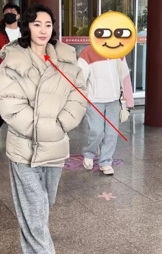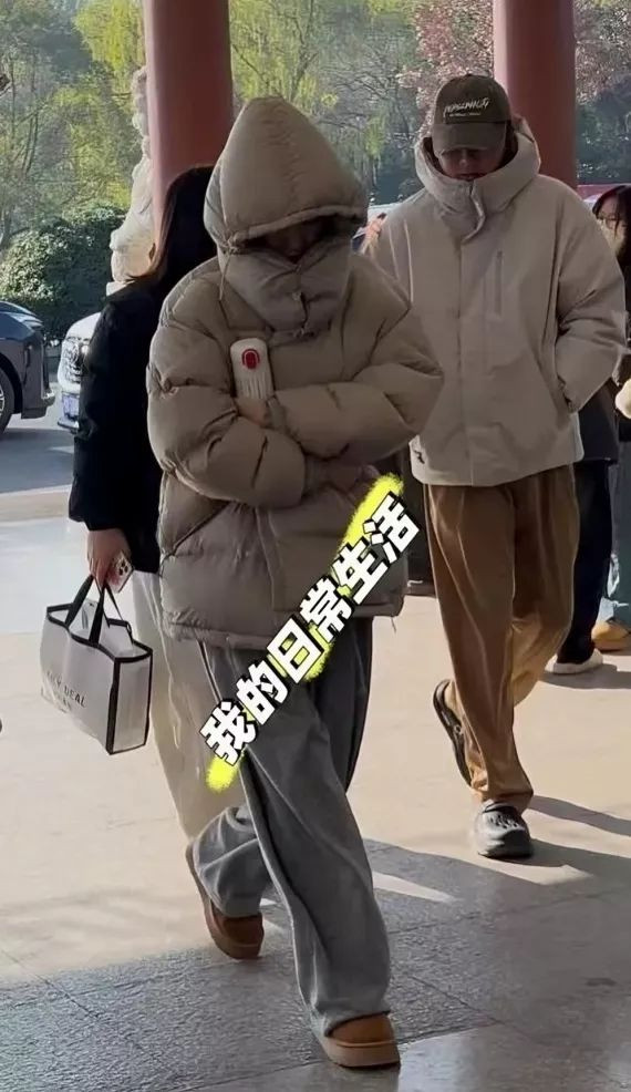 当天她穿着卡其色羽绒服,搭配了一条灰色的宽松运动裤。