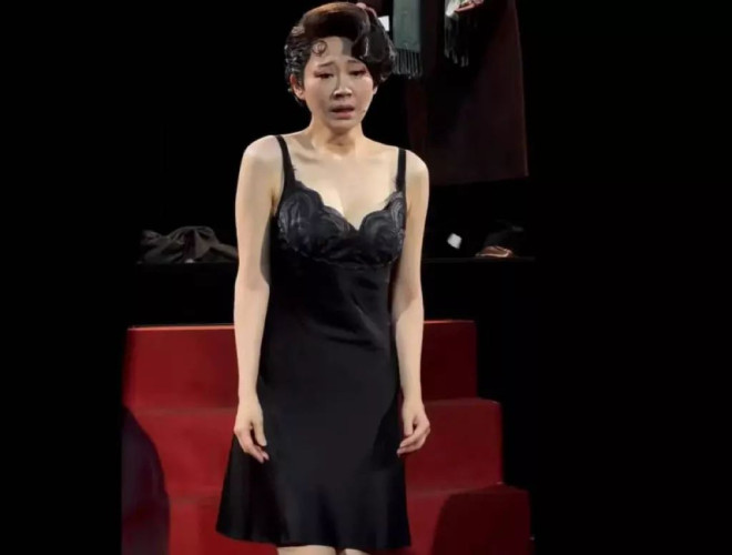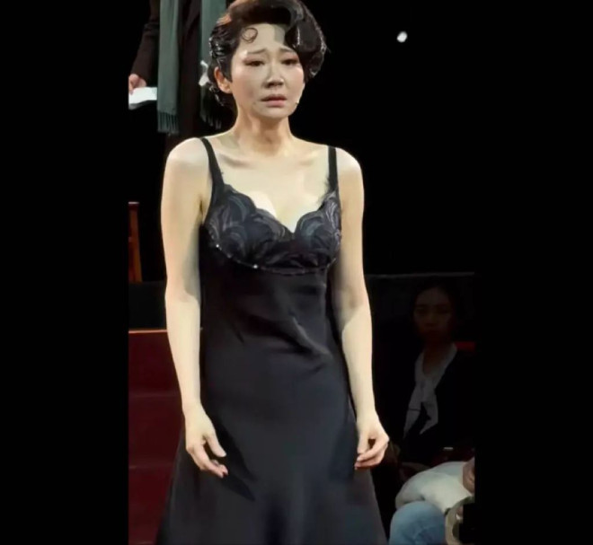 话剧中许晴早期作为上海名妓,穿着性感的蕾丝裙,复古风的盘发尽显风情。身材干瘦、倒显得少了那么点风情。