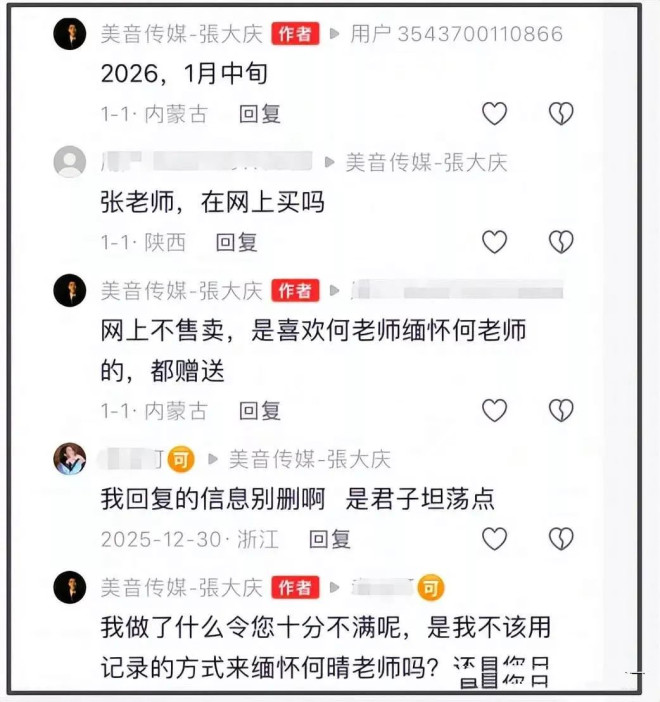 张大庆说这些书不会在网络上售卖,全都送给喜欢何晴的粉丝们。预计2026年1月中旬,就可以出版了。