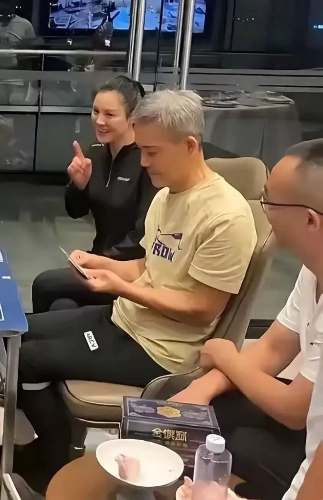 在王石旁边,分别坐了一男一女。女生穿一身黑衣、扎着高马尾,看起来青春靓丽的。男士坐在一侧,似乎帮王石看牌,有说有笑的氛围很轻松。
