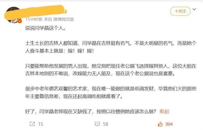 就在大家围着 “哭穷真假” 吵得不可开交时,一位博主突然扔出颗深水炸弹。这位疑似知情人的账号直言:“闫学晶在吉林有名气,不是因为戏好,是‘嫁得明白’—— 个人奋斗史浓缩成仨字:嫁!嫁!嫁!”