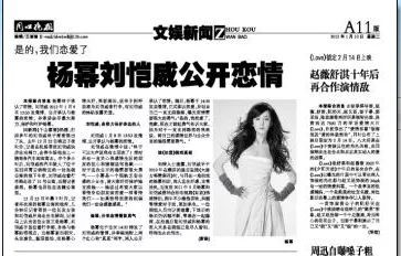 2012年,杨幂刘恺威公布恋情,热到上了报纸。