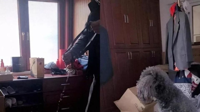 家中的门后挂着晾干后反复使用的一次性口罩,手中的保温杯内壁茶渍厚重,一看就使用了多年。 他坐的沙发是朴素的木头布艺沙发,家里的柜子上堆着不少东西。